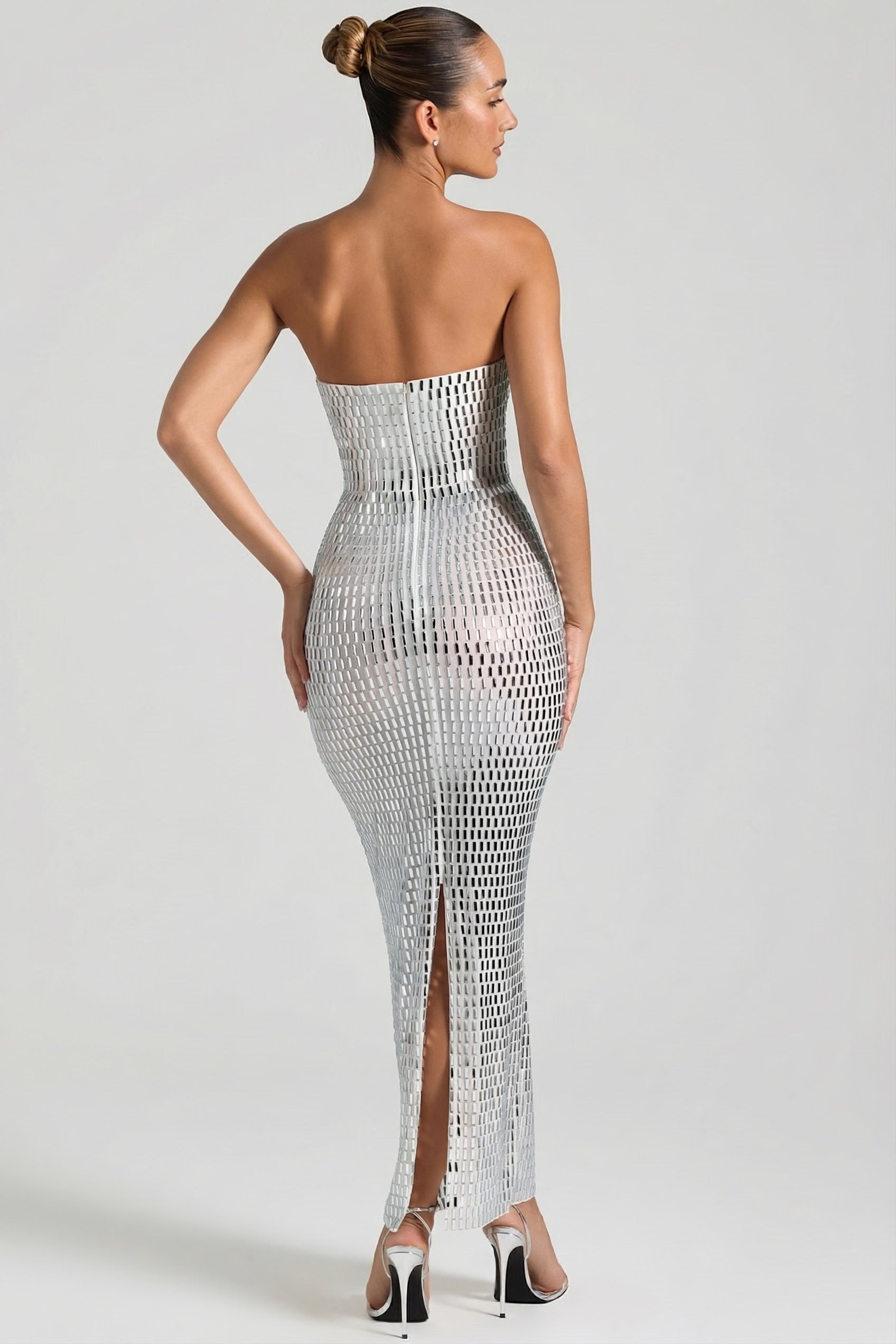 Stand out in this strapless embellished mesh gown, designed with a grid of shimmering accents that catch the light beautifully. The sheer mesh overlay and supportive lining create a striking, modern look, while the curve-hugging silhouette and back slit offer effortless movement. Perfect for any special occasion or glamorous event.