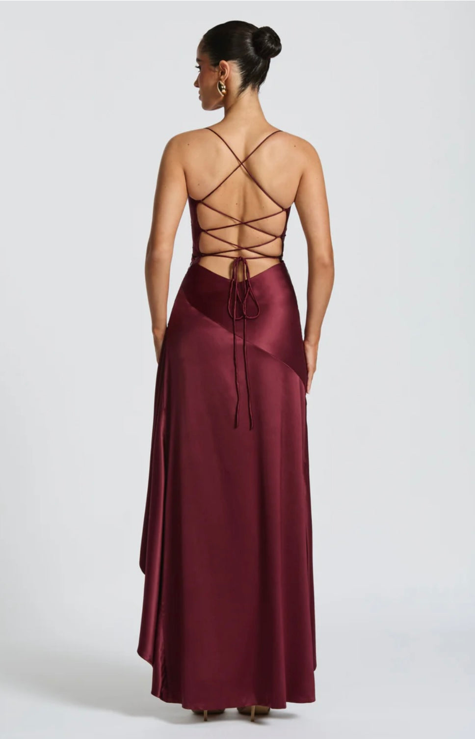 Embrace refined elegance with the Soraya Maxi Slit Dress, made from luxurious satin that glides smoothly over the body. A twist cowl neckline enhances its allure, complemented by the striking high-low hem with cascading ruffle, thigh high split. The adjustable crossover lace-up back ensures a tailored fit, allowing you to move with ease and confidence. Style with nude heels and a sleek clutch for an effortlessly chic look.
